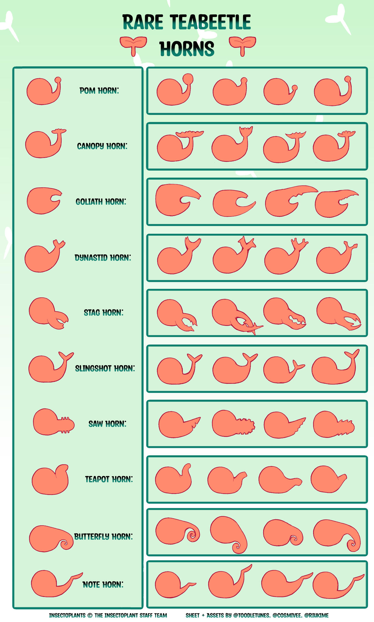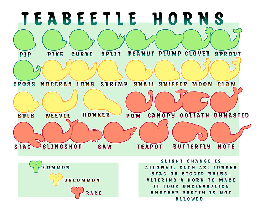 Some traits change rarity depending on the subspecies.REQUIRED traits are in bold, while SPECIES EXLUSIVE traits are underlined.Species exclusive traits CAN NOT be used by any other subspecies!ALL subspecies can now utilize nose horns! Snouts are optional on all subs.ONLY Teabeetles cannot utilize optional snouts, they MUST have a nose horn at all times.