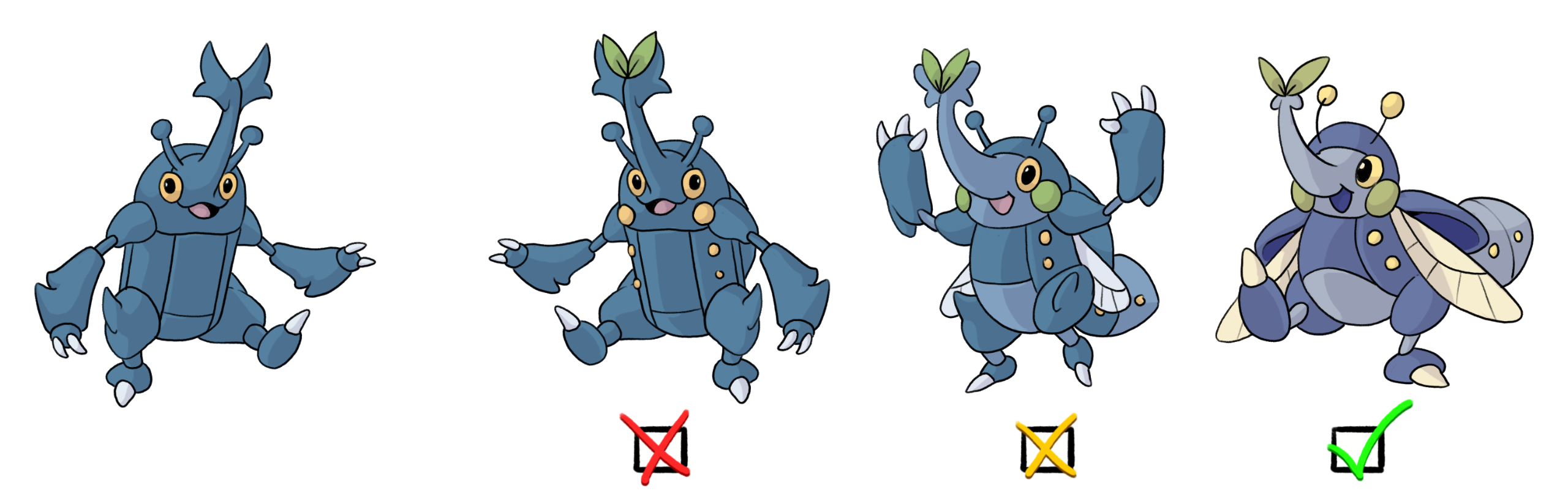 Changing a little bit of everything including the overall silhouette like the bottom right (green X) is allowed! These changes are perfect since both up-close and zoomed out it'd be hard to mistake your Insectoplant for their inspiration!