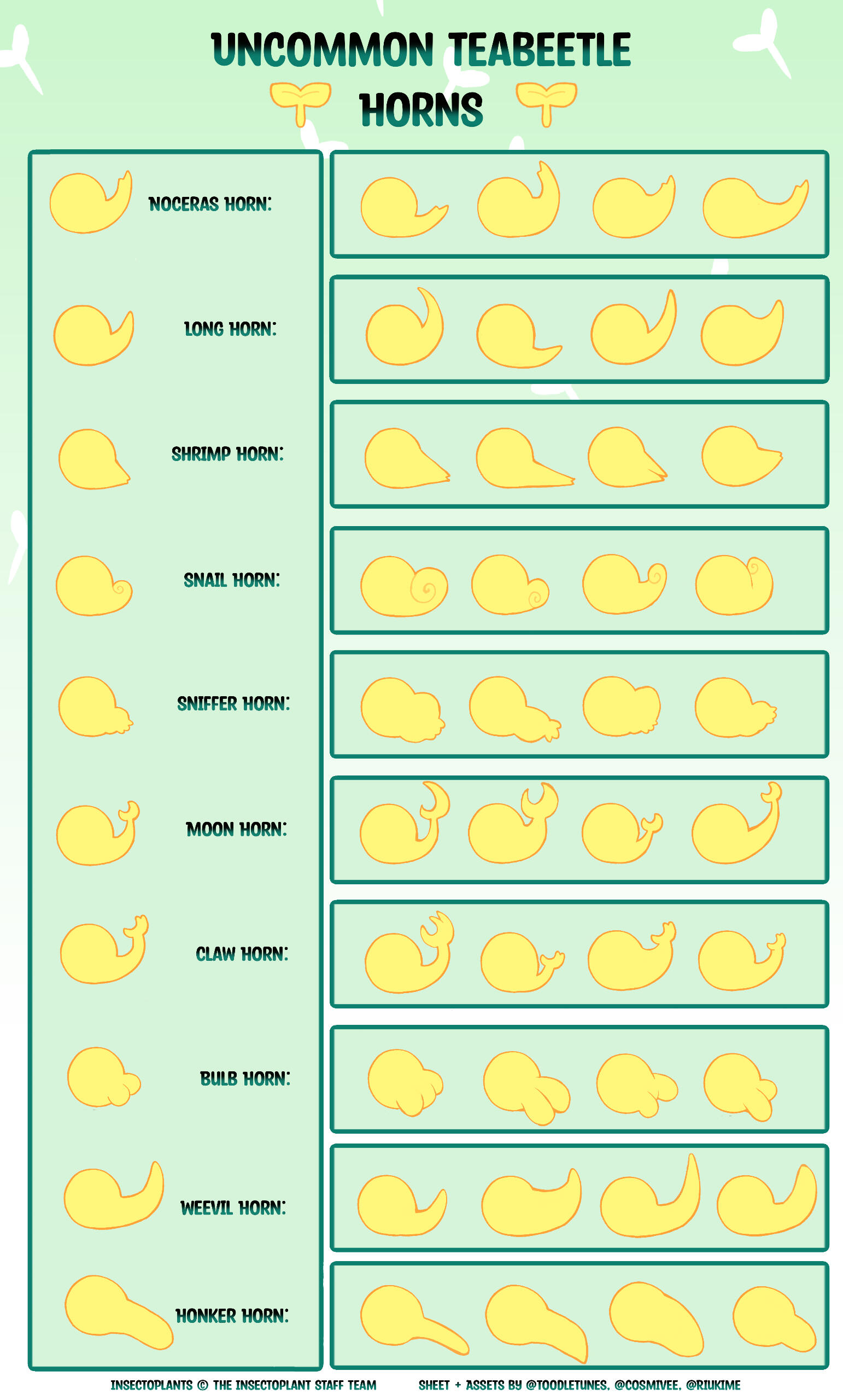 Teabeetles require a Horn trait, while the other subspecies have rounded snouts instead. All subspecies can now use nose horns as well, but its up to you and is totally optional! Otherwise all subspecies are able to utilize smooth snouts.